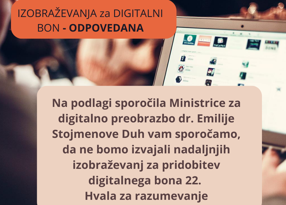 Ministrica za digitalno preobrazbo dr. Emilija Stojmenova Duh je 13.9. na tiskovni konferenci sporočila, da bo Javni razpis za sofinanciranje izvajanja neformalnih izobraževanj za odrasle, stare 55 let ali več na področju digitalnih kompetenc za leto 2022 (v nadaljevanju: razpis) v petek, 16. 9. 2022, razveljavljen in napovedala, da bo novela Zakona o spodbujanju digitalne vključenosti na nediskriminatoren način omogočila usposabljanje vsem, ki to želijo in potrebujejo.