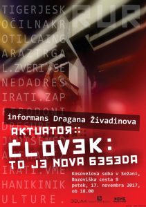 17. novembra 2017 smo se počastili dvema velikima predstavnikoma slovenske zgodovinske avantgarde, Srečku Kosovelu in Avgustu Černigoju. Zavod Delak je v sodelovanju s Kosovelovo sobo in društvom Konstruktivist uprizoril informans Dragana Živadinova z naslovom AKTUATOR:: ČLOVEK: TO JE NOVA BESEDA. Metapredavanje Dragana Živadinova se je začelo v Kosovelovi spominski sobi in se nato nadaljevalo v mehanični delavnici nekdanjega podjetja Kraški zidar.